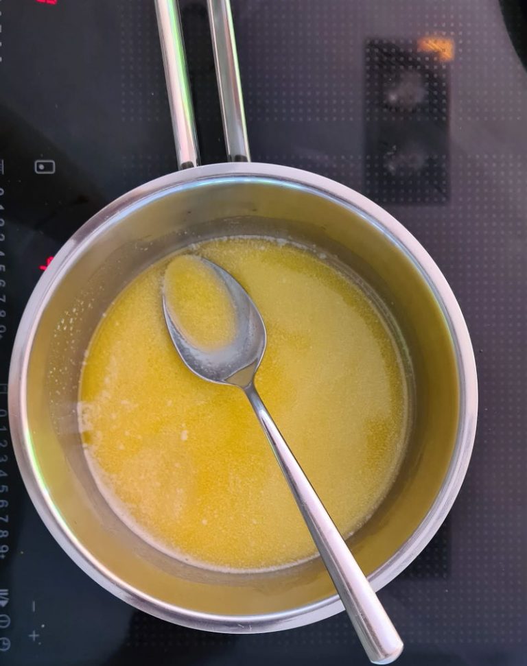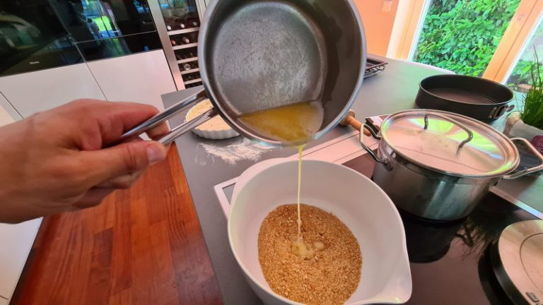 - Die 90 gr. Butter in einem kleinen Topf bei geringer Hitze schmelzen lassen. Anschließend die Butter zu den Keksbröseln geben und mit einem Löffel verrühren.