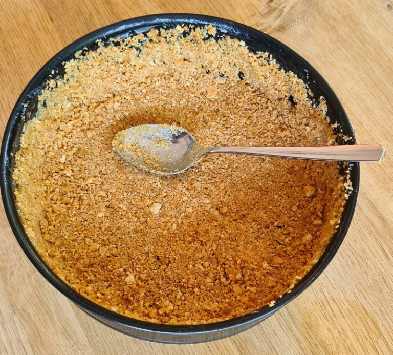 - Nun die Butter-Keks-Masse mit der Rückseite eines Esslöffels ca. 2 cm hoch am Springformrand hoch drücken und den Boden fest andrücken. Anschließend für ca 10 Minuten kalt stellen.